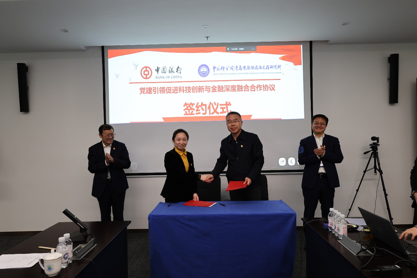 座谈伊始,青岛能源所副所长、党委委员吴绪永与中国银行青岛市分行副行长谭如玮代表双方签署了《党建引领促进科技创新与金融深度融合合作协议》,吕雪峰、王峰共同见证。标志着双方从“党建共建”升级为“党建+业务协同”新模式,为创新链与金融链深度融合提供制度保障。